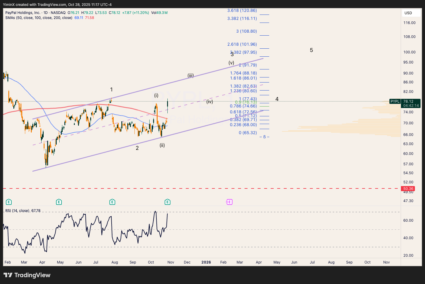 This price jump likely indicates wave (iii) of 3 underway, with a near-term target of $82+.