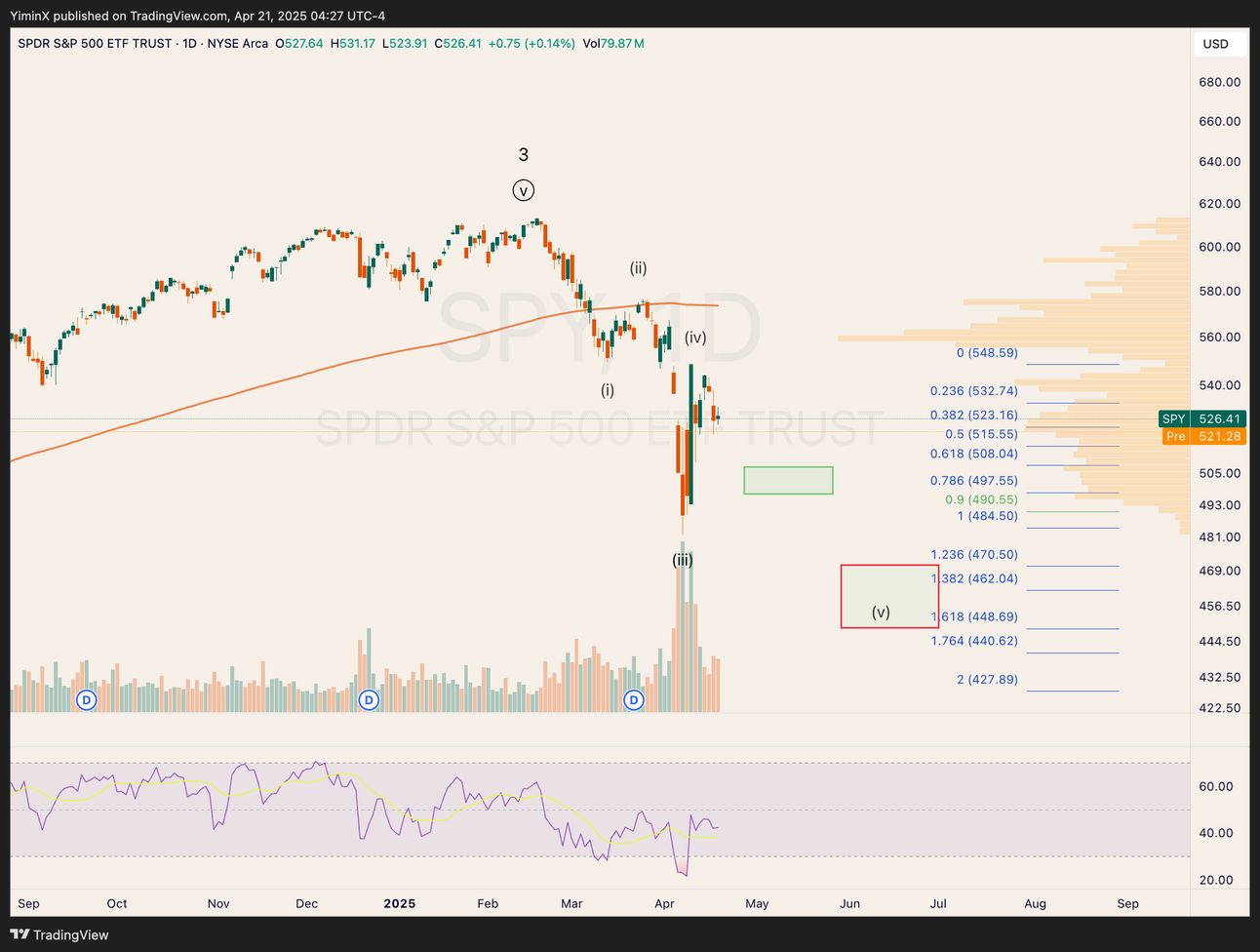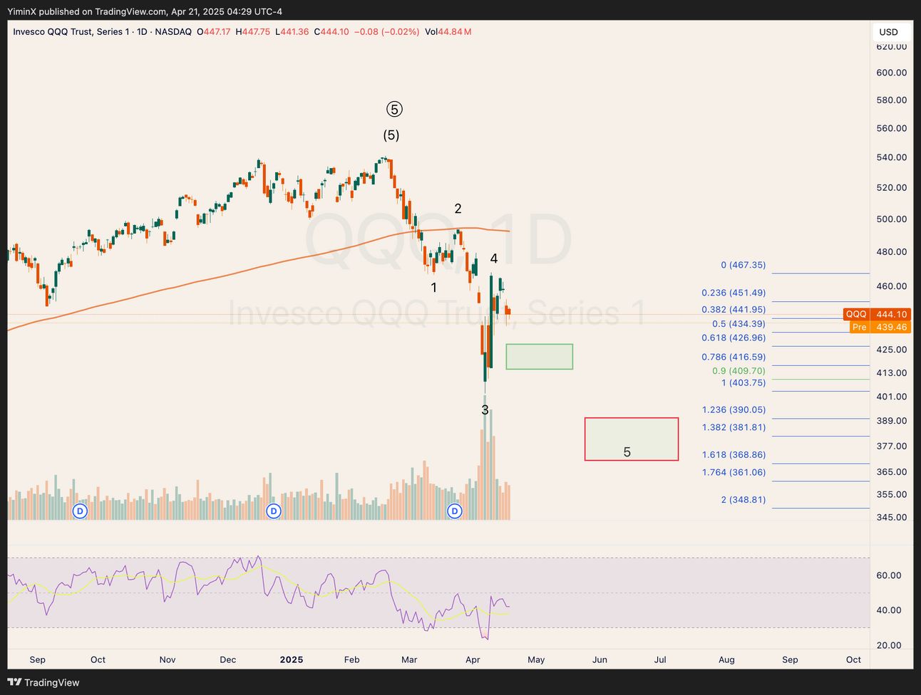 QQQ is also down 1% in London hours. This fits our expectation of a retrace towards $426 as the first stop.