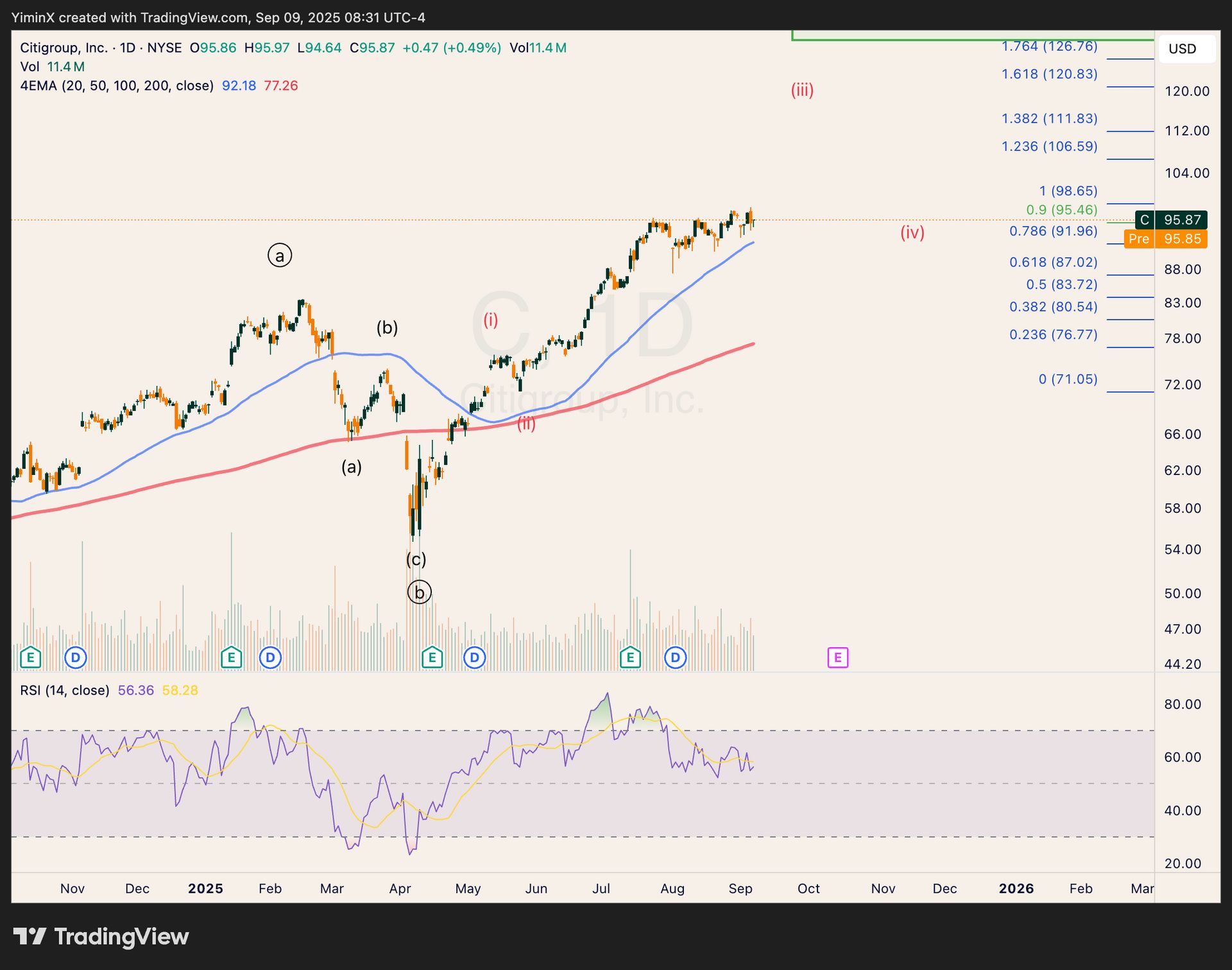 C has all but reached our initial target of $100. It is in a strong wave (iii) uptrend.