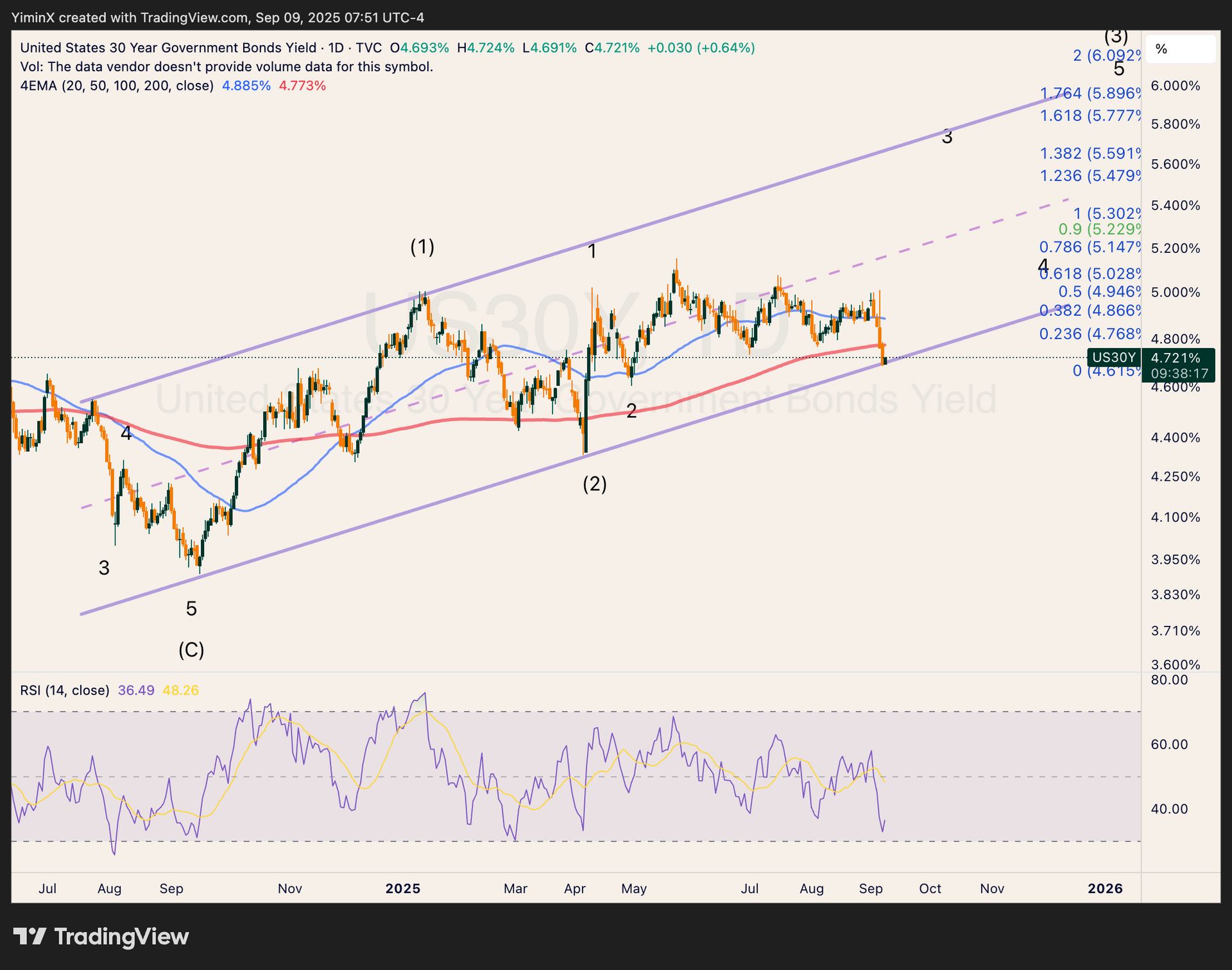 The 30-year yield is challenging the bottom of the channel established in the past year.