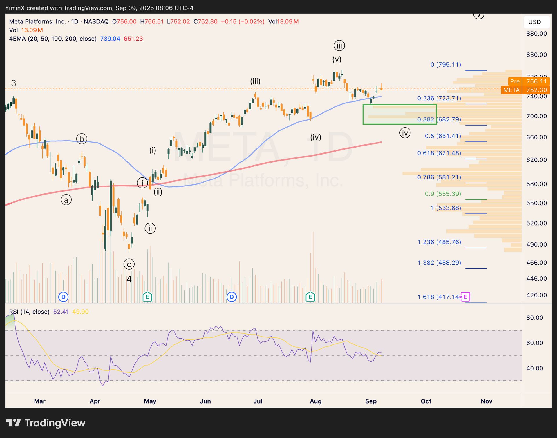 META holds above the 50-day MA. Technically, its recent pullback was sufficient for the wave circle-iv, at the 0.236 retrace of wave circle-iii, but we want to see more constructive price actions to confirm the bottom.