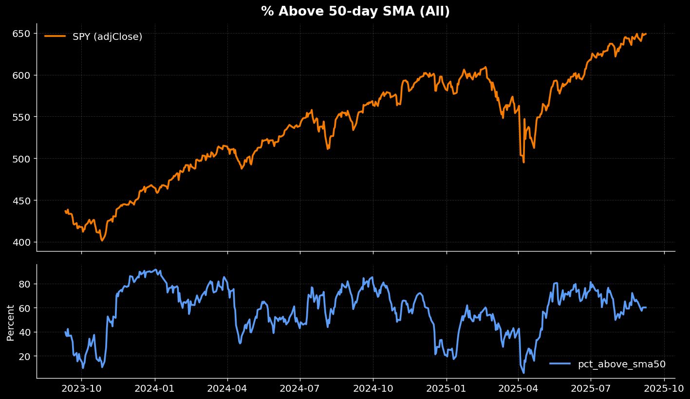 The percentage of S&P 500 components above their 50-day MAs is high, but is declining. This puts SPY's next moves more sensitive to the performance of the large caps.