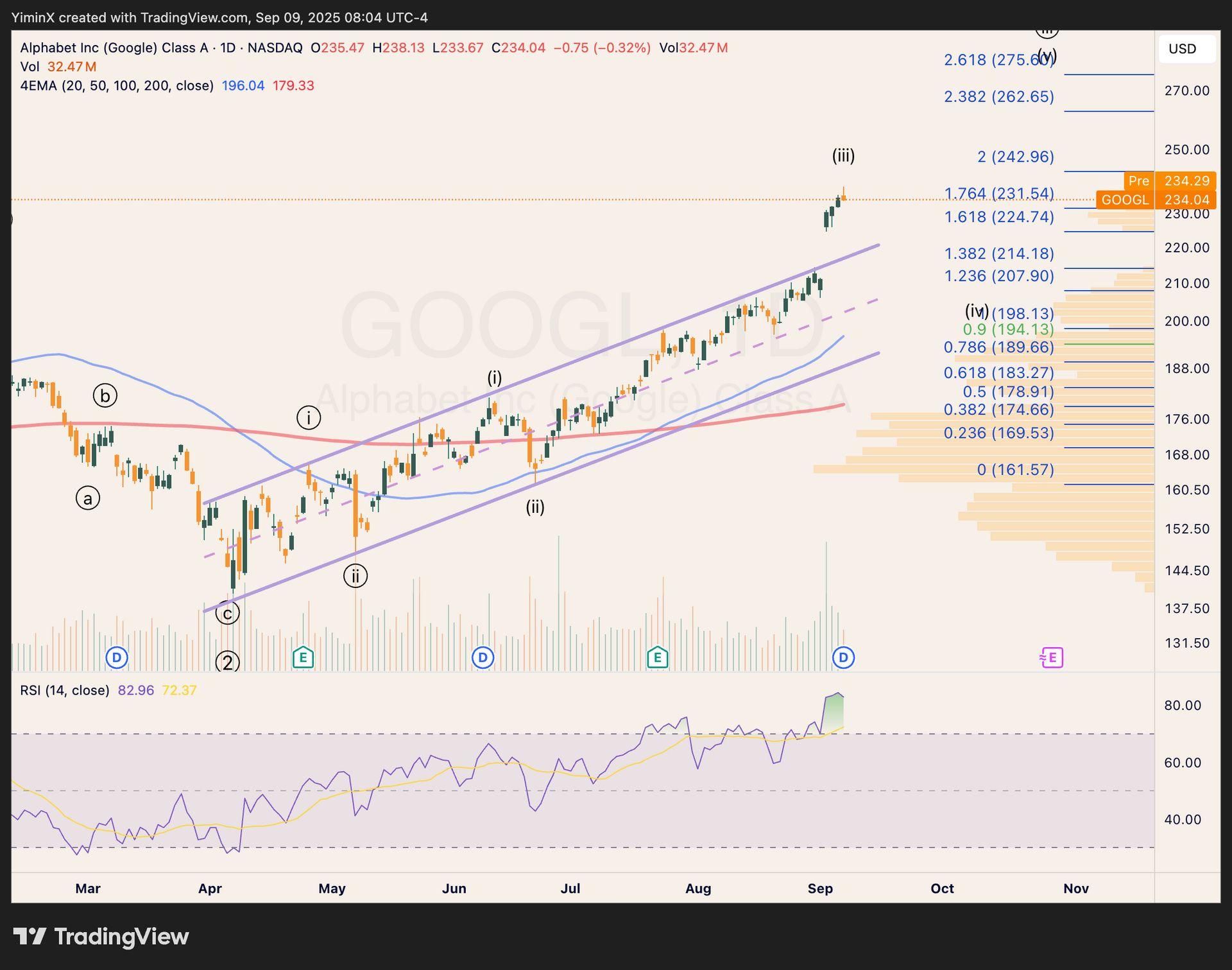 GOOGL is in a deeply overbought condition, with wave (iii) now stretching above the 1.763 extension of wave (i). I am cautious here.