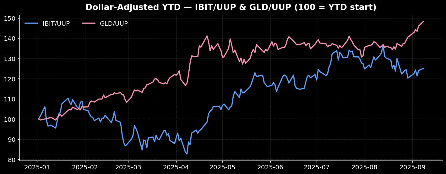GLD has surged recently on a US dollar-adjusted basis. At the same time, IBIT has rolled over in recent weeks. The divergence could signal investors rotating out of risk assets into safe havens.