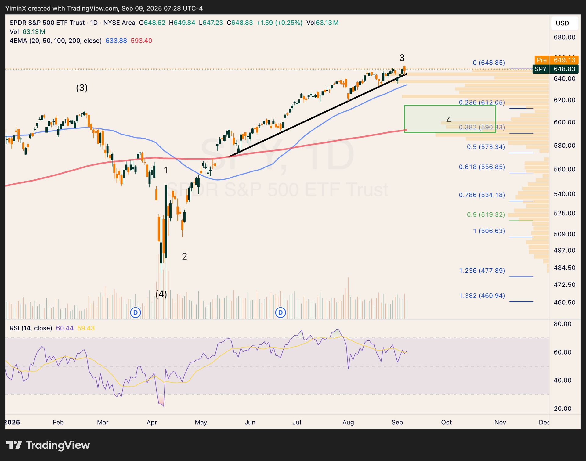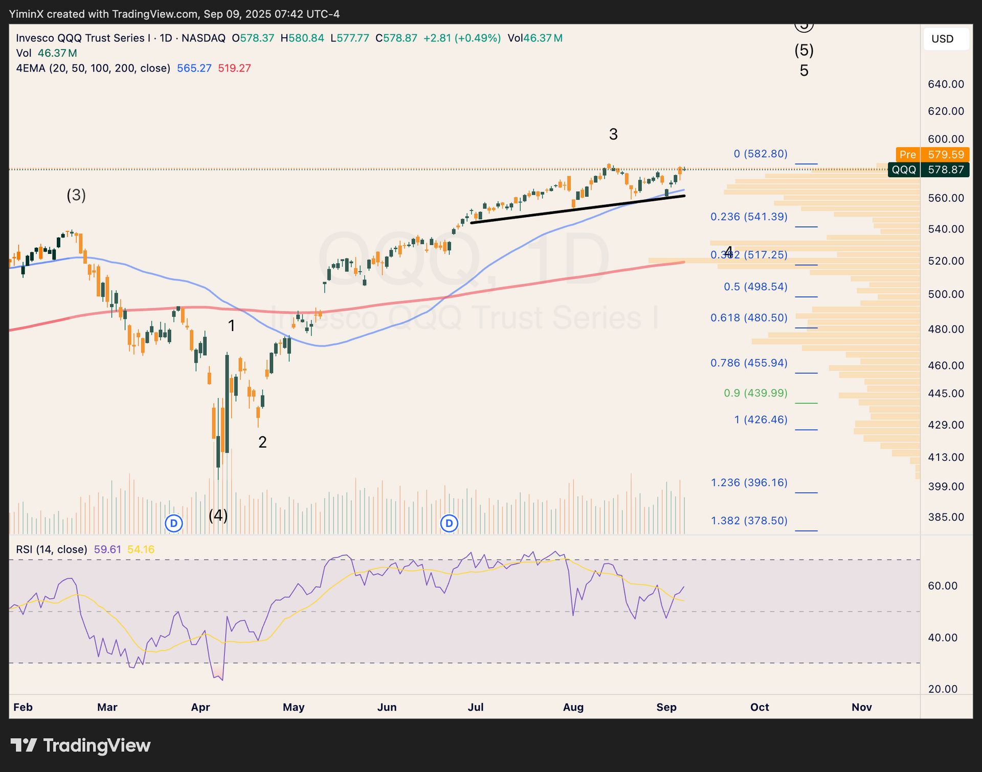 QQQ’s climb has definitely slowed since August, as we barely trade above the July 31st high. However, until we see a sustained breakdown below the 50-day and the July-September trendline, we cannot confirm the start of a wave 4.