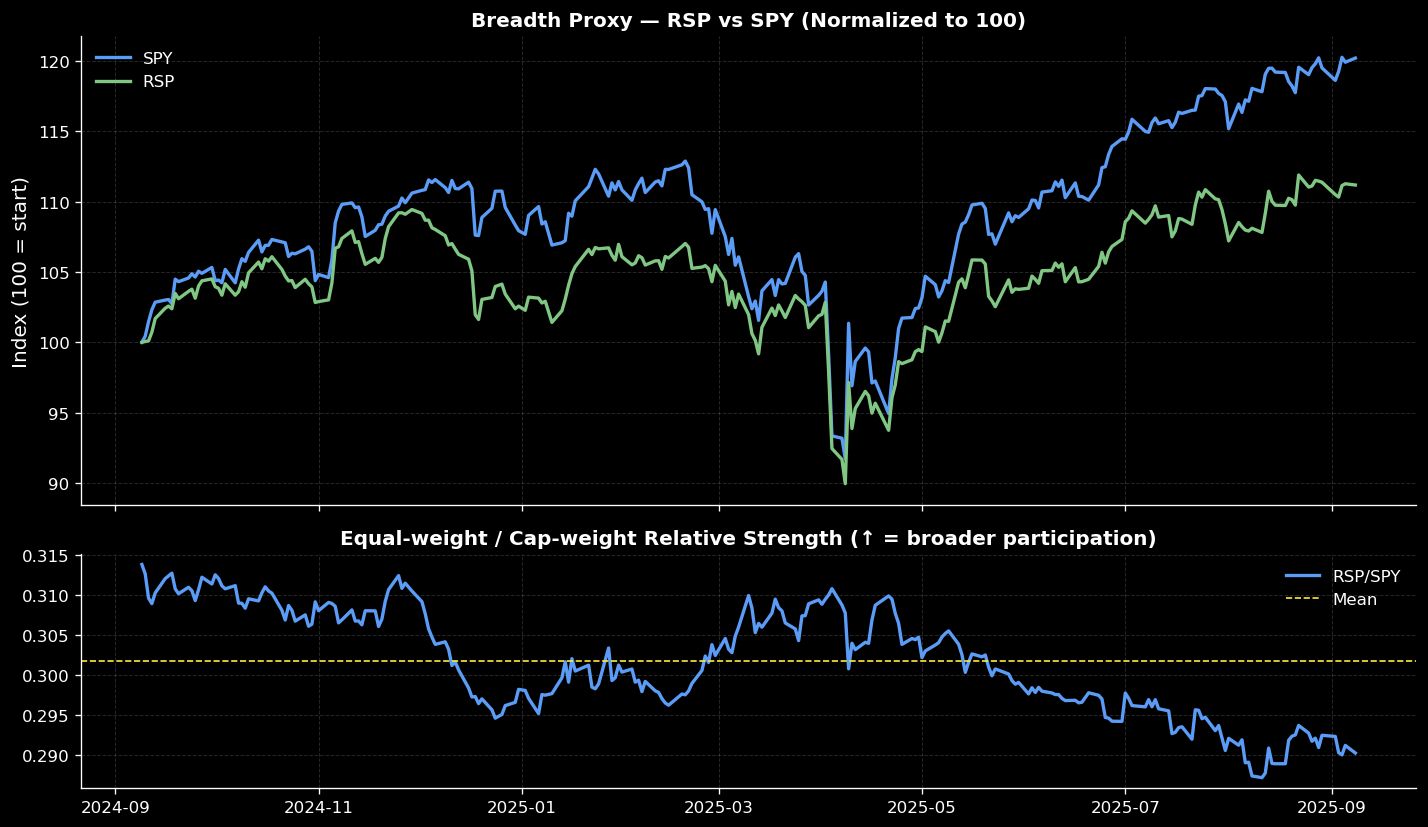 This is not a big issue yet, but I would be watching for the potential divergence between the two. If RSP starts falling and failing to recover the highs, we could see strong headwinds in SPY.