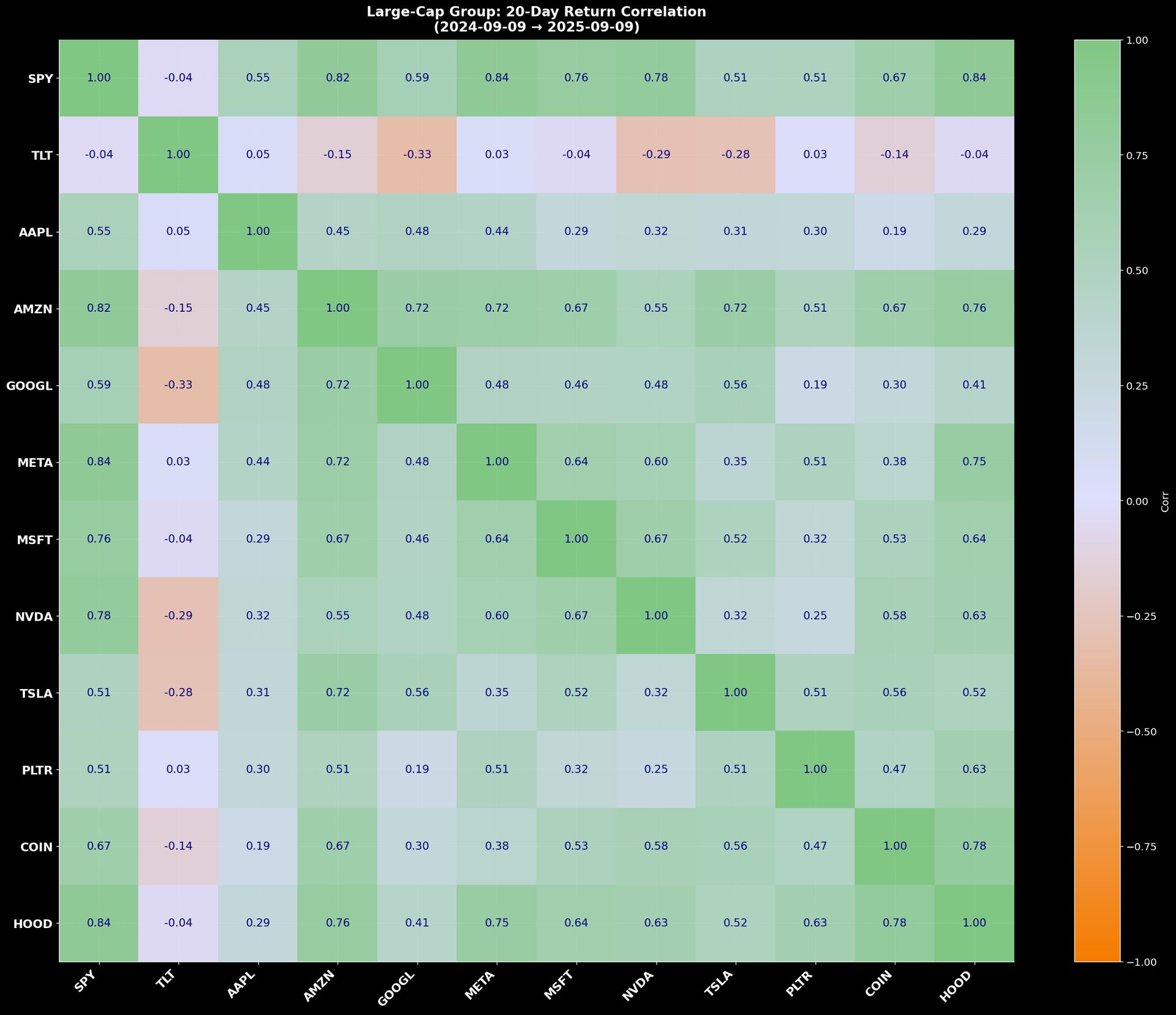 TLT continues a fairly neutral relationship with the large-cap stocks. AAPL and PLTR have shown the smallest positive correlations with their peers.