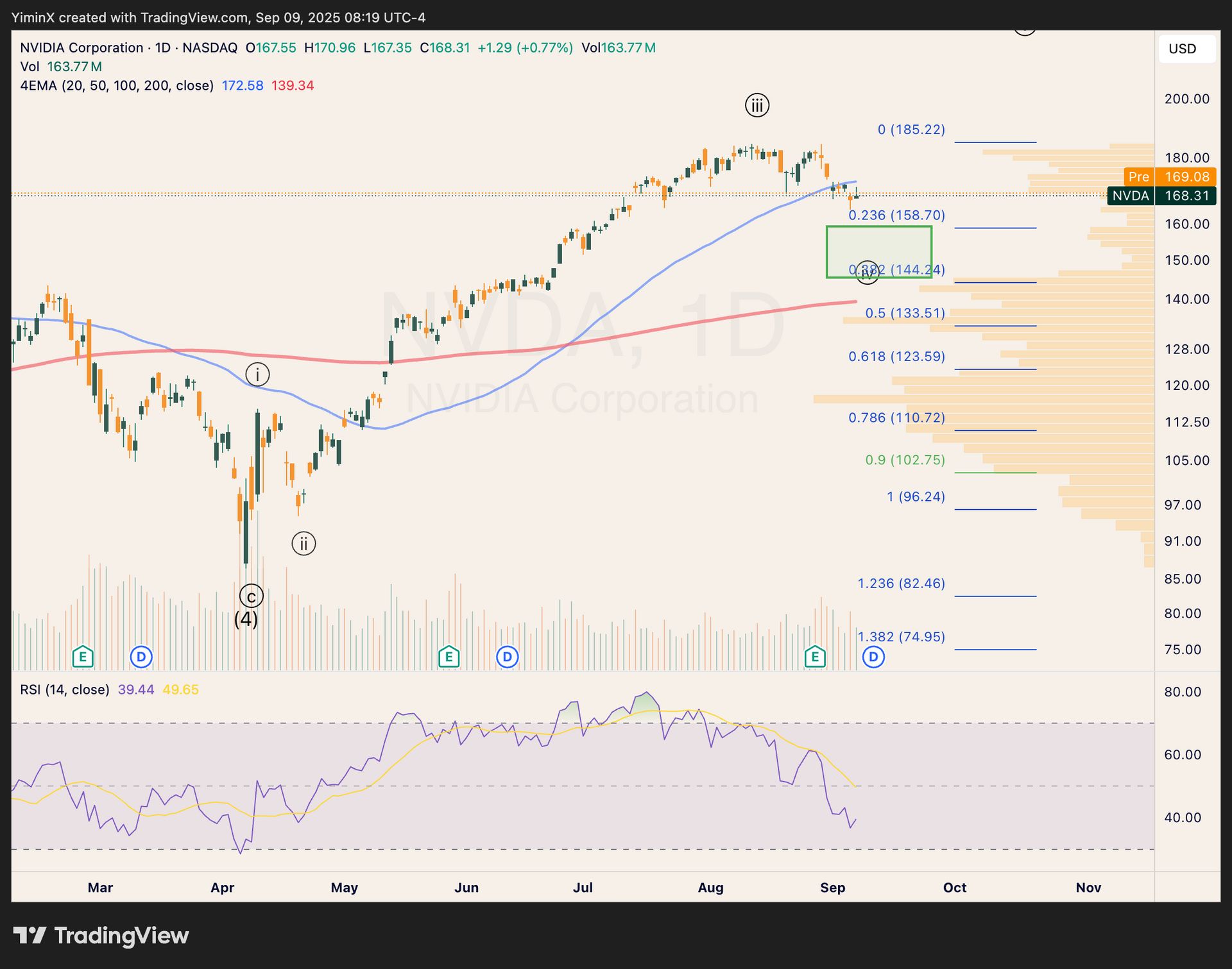 NVDA could not recover the 50-day MA still. The short-term trend favours a test of our minimum wave iv target at $158.