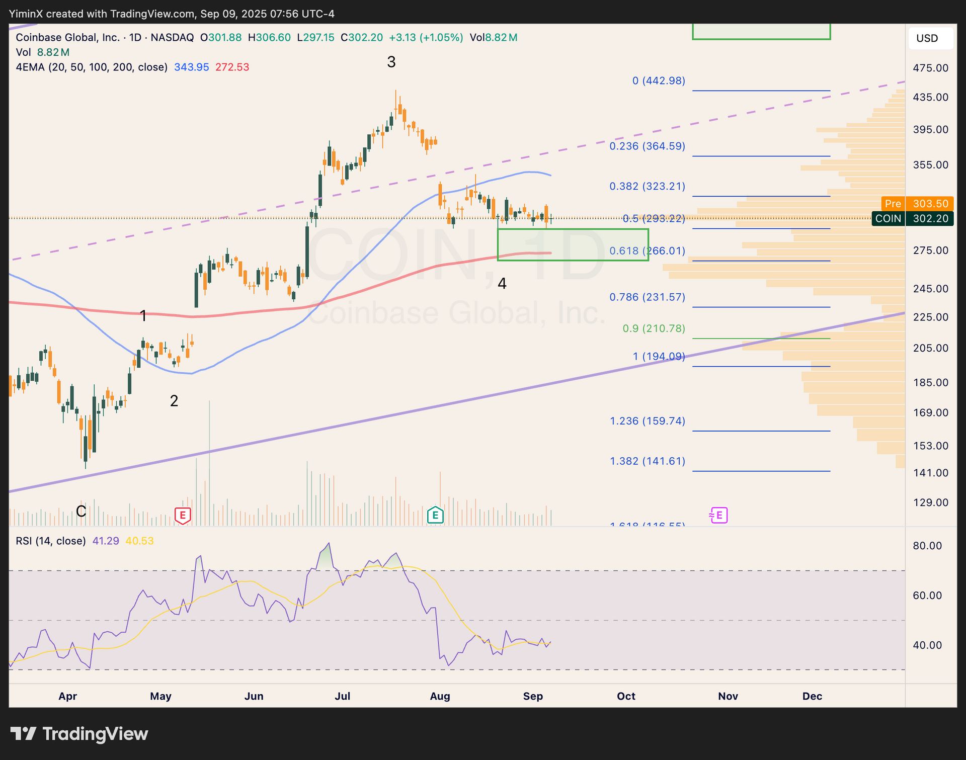 There is a risk that we see COIN retest the 200-day MA in the near term, above which the volume profile is thin.