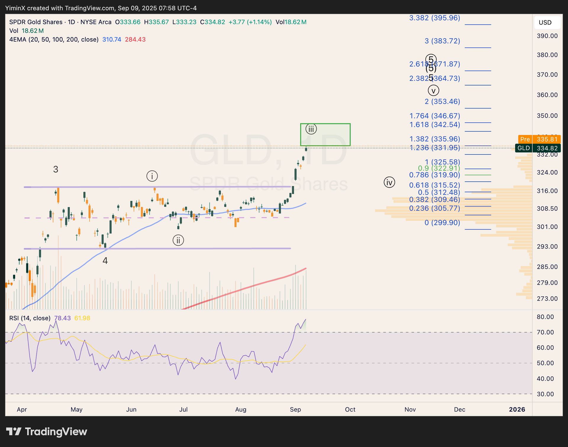 GLD has all but reached our minimum wave iii target of $336. There is room for further upside towards $346 before it is considered as stretched.