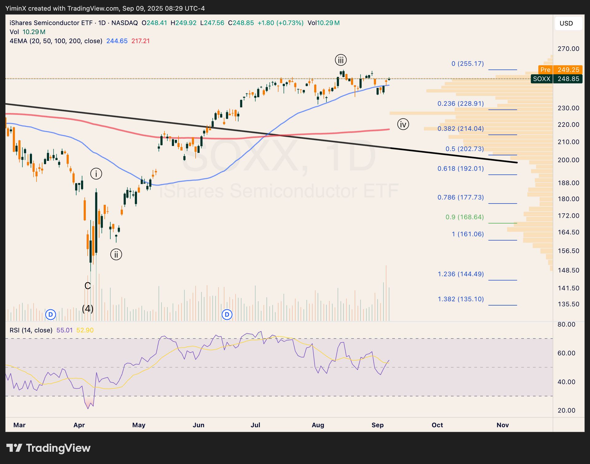 SOXX has not reached our minimum wave iv target, but is holding above the 50-day MA. It could still follow NVDA in the near term for further downside moves.