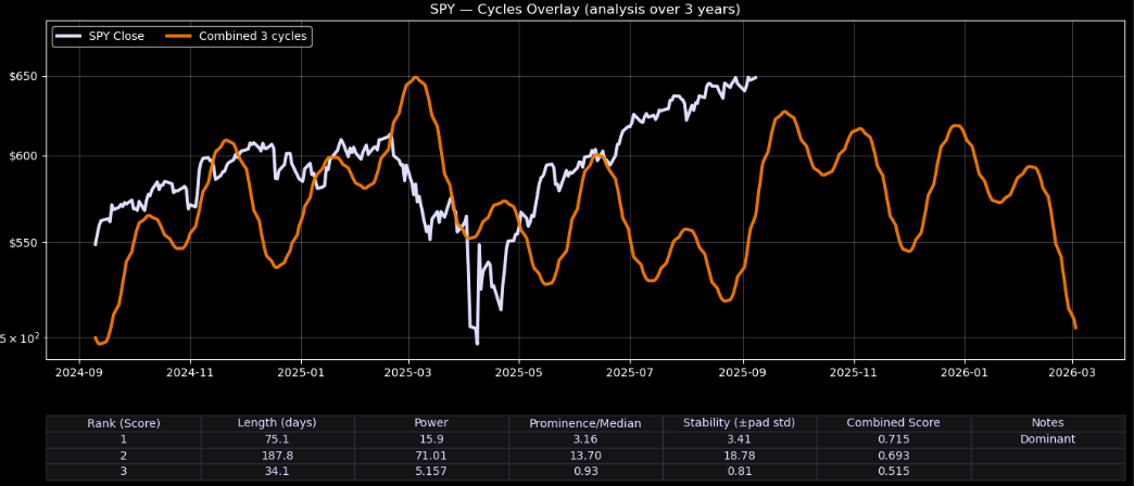 For SPY, the dominant rhythm is approximately 75 trading days (~3.5 months), supported by a broader swing of around 188 days and a weaker short-term oscillation of roughly 34 days.