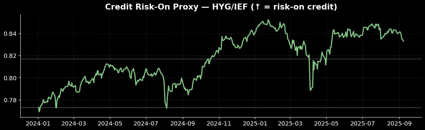 At the same time, the HYG/ IEF ratio, used as a “risk-on” proxy for credit, has been slightly declining. This means investors are bidding more for the short-end risk-free Treasuries than high-yield credit.