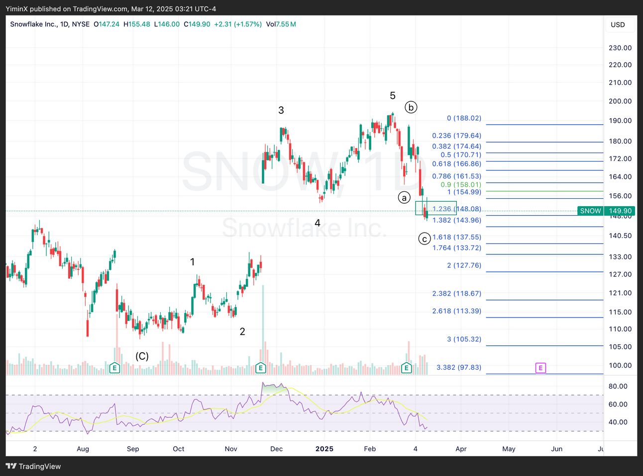 SNOW has reached the target zone for the initial wave C drop. It warrants a bounce here.