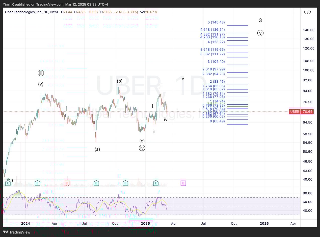 I consider UBER having completed wave circle-iv in 2024 (spent a whole year consolidating). It seems ready to move forward but really needs to complete that wave v target at $88 first for confirmation. In this initial move, wave iv can overlap into wave i in a leading diagonal pattern.