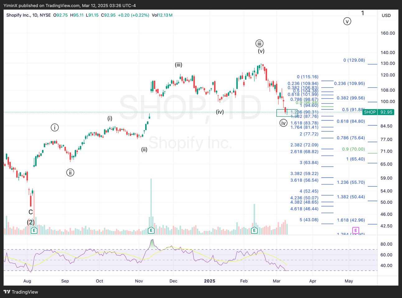 I lean towards wave circle-iv having completed for SHOP, which is the 50% pullback of wave circle-iii.