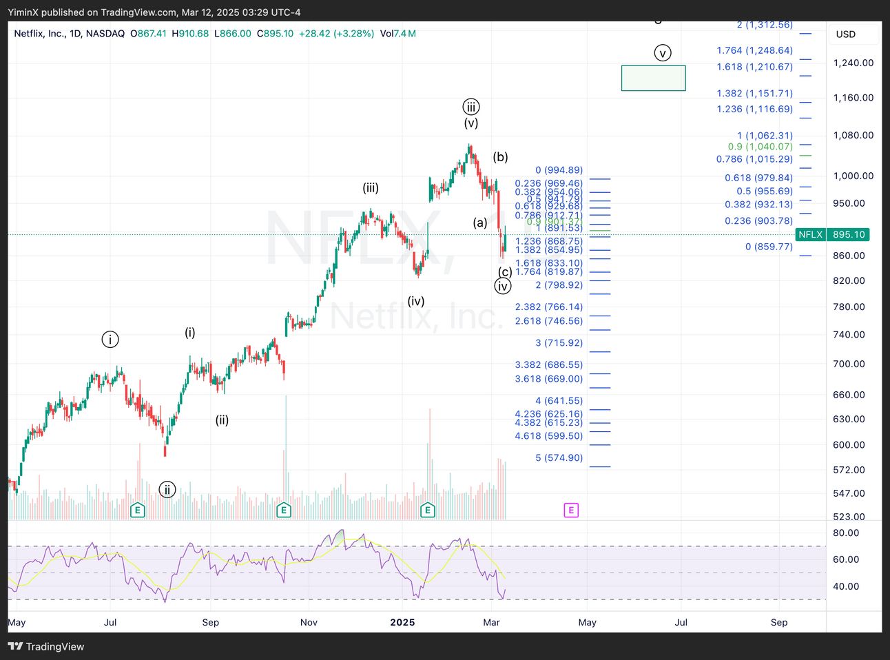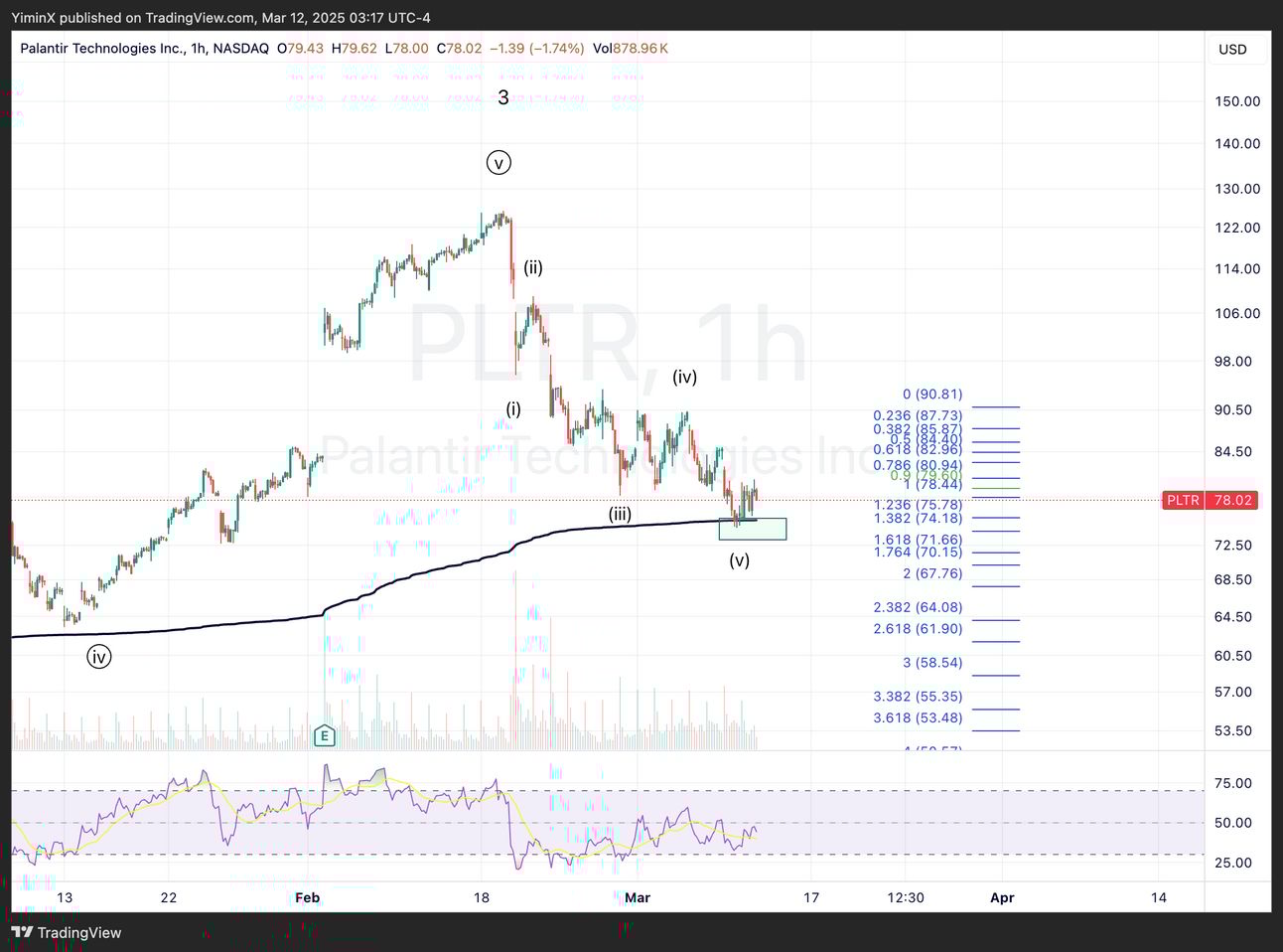 We have tracked PLTR very well since the final week of February. PLTR briefly touched the wave (v) target of $74, which is also the VWAP since October 2024. There is room to go towards $71, as the 1.618 inverse extension of wave (iv).