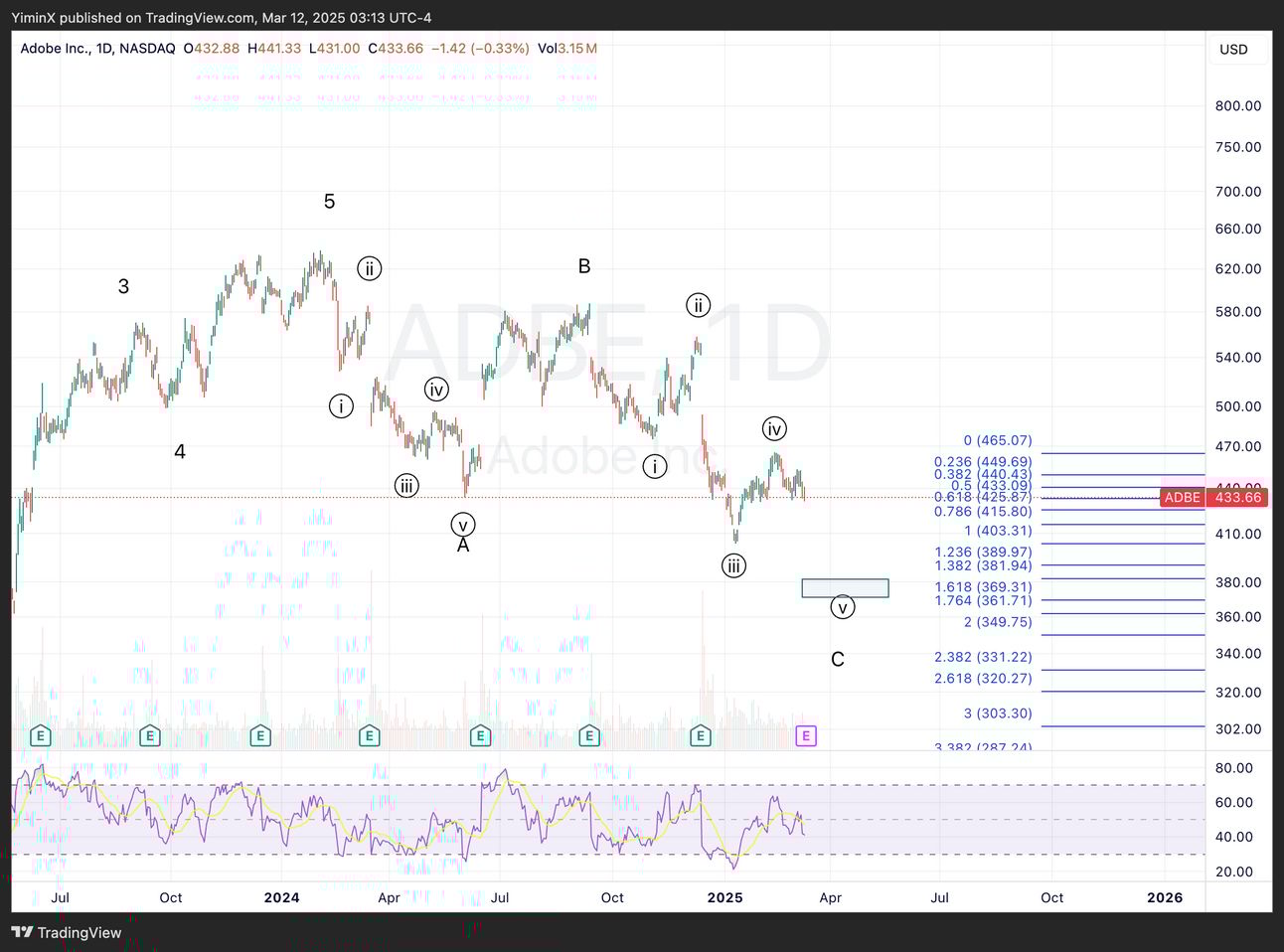 ADBE is still trying to finish its wave C, although it is likely in wave v of C, with a target of $380. This is the 1.382 inverse-extension of wave iv.