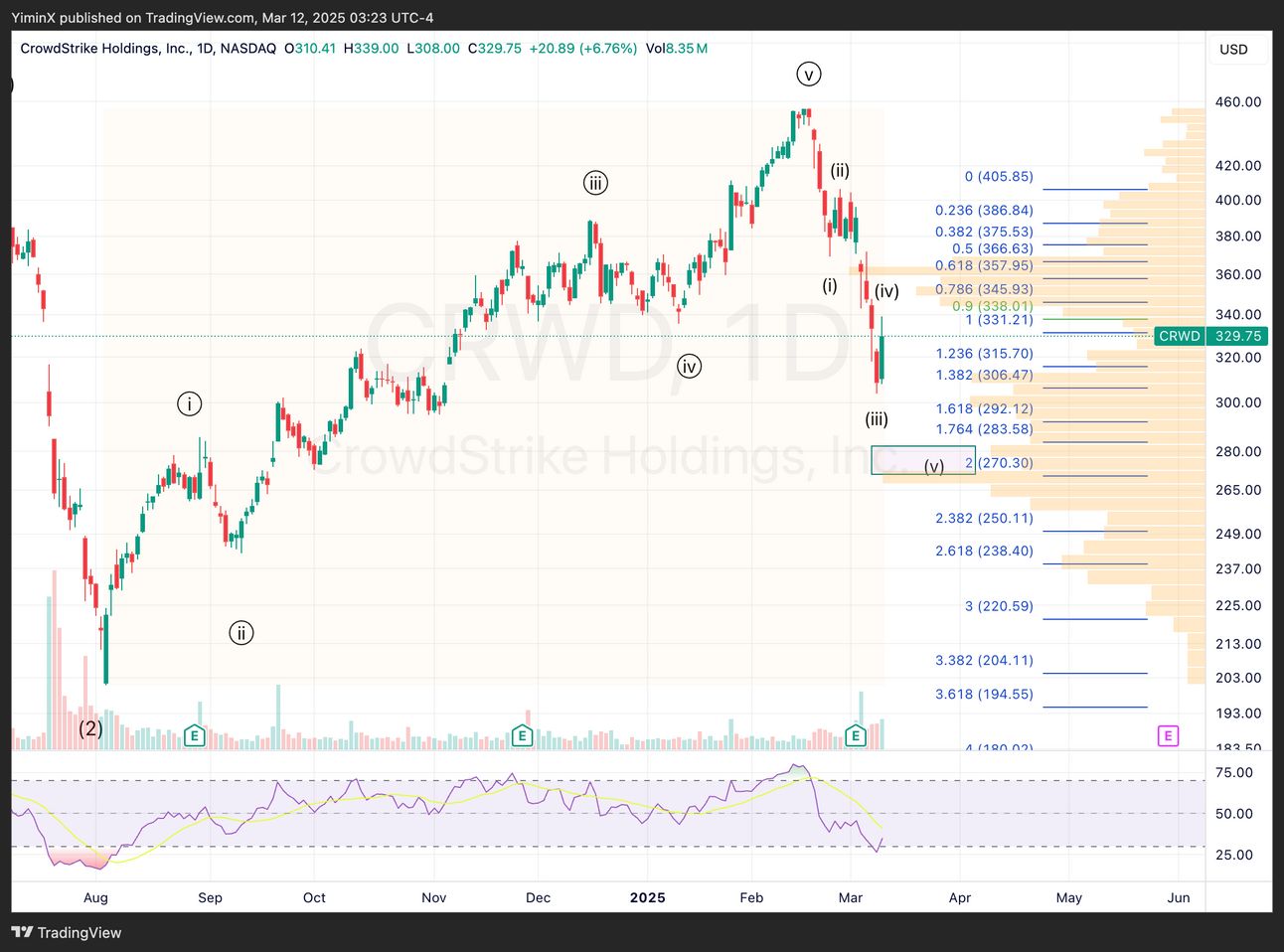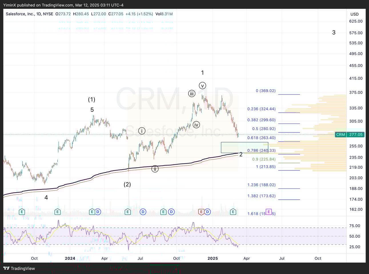 CRM is close to the target zone for wave 2 pullback, between the 0.618 and 0.786 retrace of wave 1. This is also the area of highest trading volumes. It also sits right above the VWAP from December 2022 low, which has acted as support.