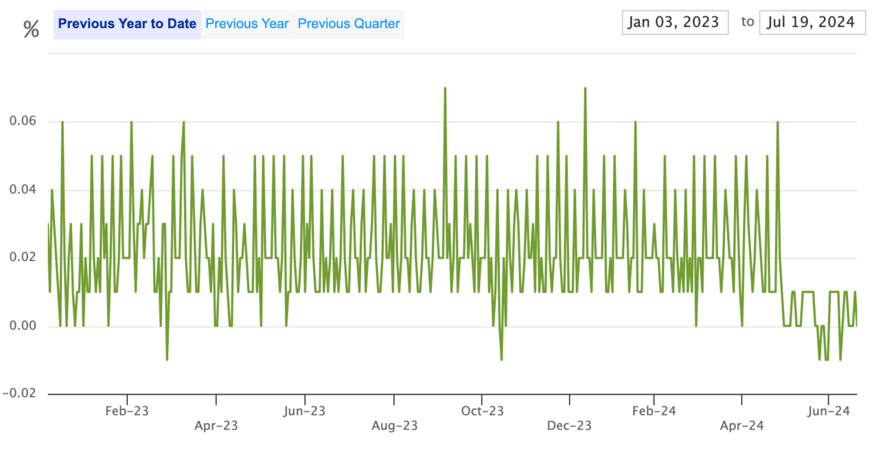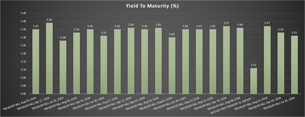 The weighted average Yield To Maturity is currently 5.34%. The Effective Fed Funds Rate (EFFR) is 5.33%. The 10-Year Treasury yield is 4.27% (as of July 22, 2024).
