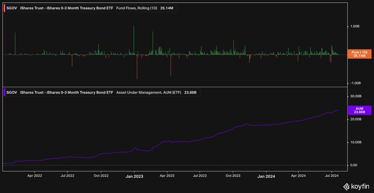 Now, SGOV manages almost $24 billion. Investors keep putting money in to earn attractive short-term returns on cash in the latest hiking cycle. The only outflow days in 2024 were the month-ends, when investors rebalance their Treasury portfolios.