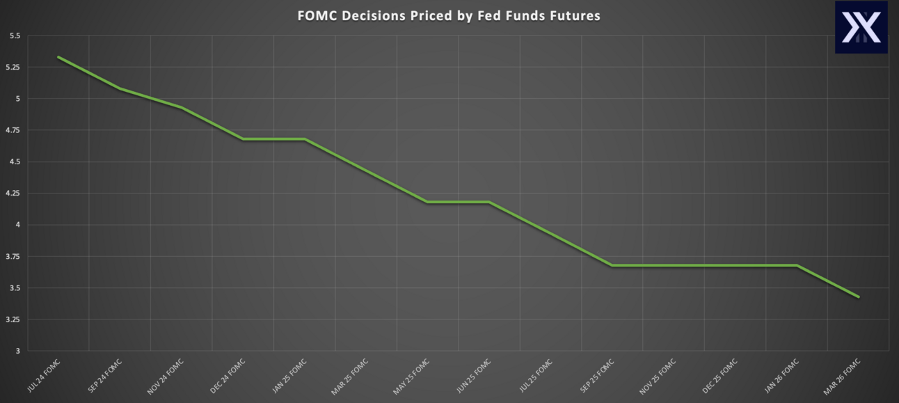 The Fed Funds Futures market predict 2.5 cuts by 2024 year-end. The market feels certain about the September and December cuts, but places a 50% chance on a November cut as well.