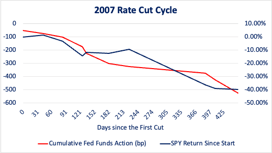 SPY (RHS scale) initially shot up as the Fed delivered a jumbo rate cut of 50bp, with investors expressing relief that the Fed could save the economy from a recession. However, as time wore on, the stock market collapsed by over 40% after 18 months, as the Fed slashed the Fed Funds rate by more than 500bp to 0%.