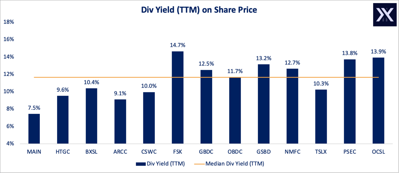 GBDC has a TTM dividend yield of 12.5%, which on its own is a high return, compared both with the median BDC dividend yield and the risk-free US Treasury yields.