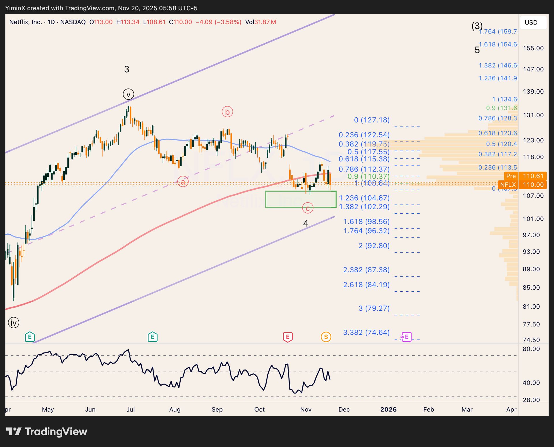 The immediate challenge for NFLX is to climb above its 200-day and 50-day MA amidst a heavy volume profile in the price region. I do think wave 5 has the potential to challenge $150, which makes the risk-reward compelling from here.