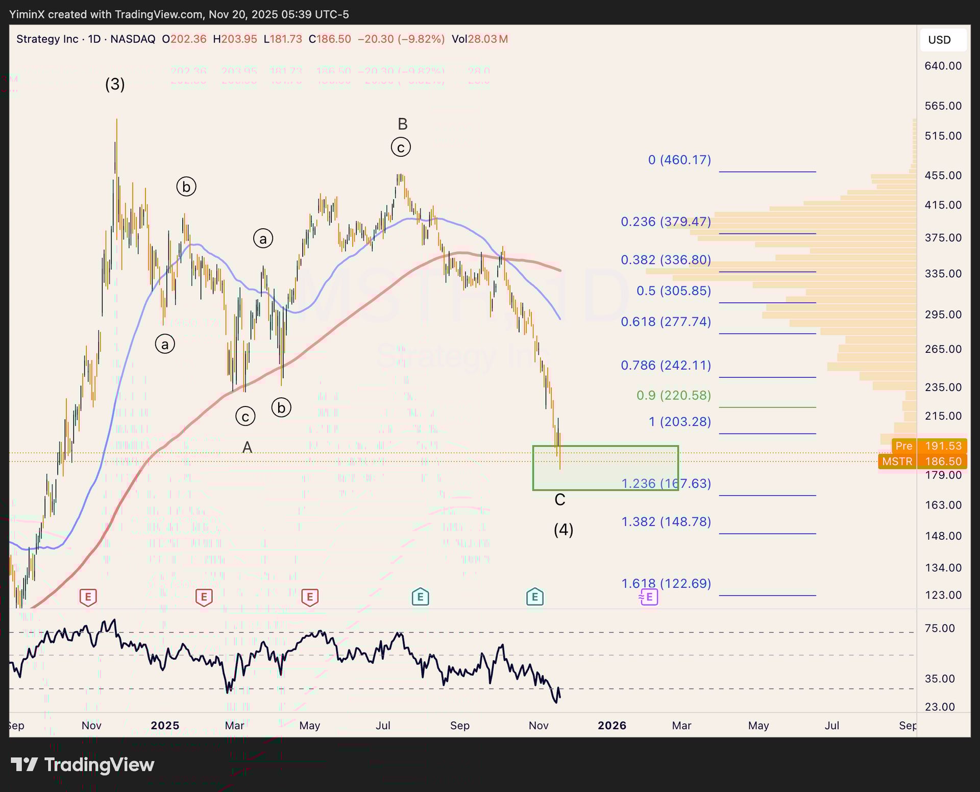 Currently, MSTR’s selloff fits a wave C description within the larger degree wave (4). Wave C can push all the way down to $167 (another 10% lower) but it’s not a requirement. If it does get to $167, the mNAV would be just 1.05x, assuming BTC’s value stays flat. I do think it begins to look attractive from there, if one is bullish on BTC (which I am).