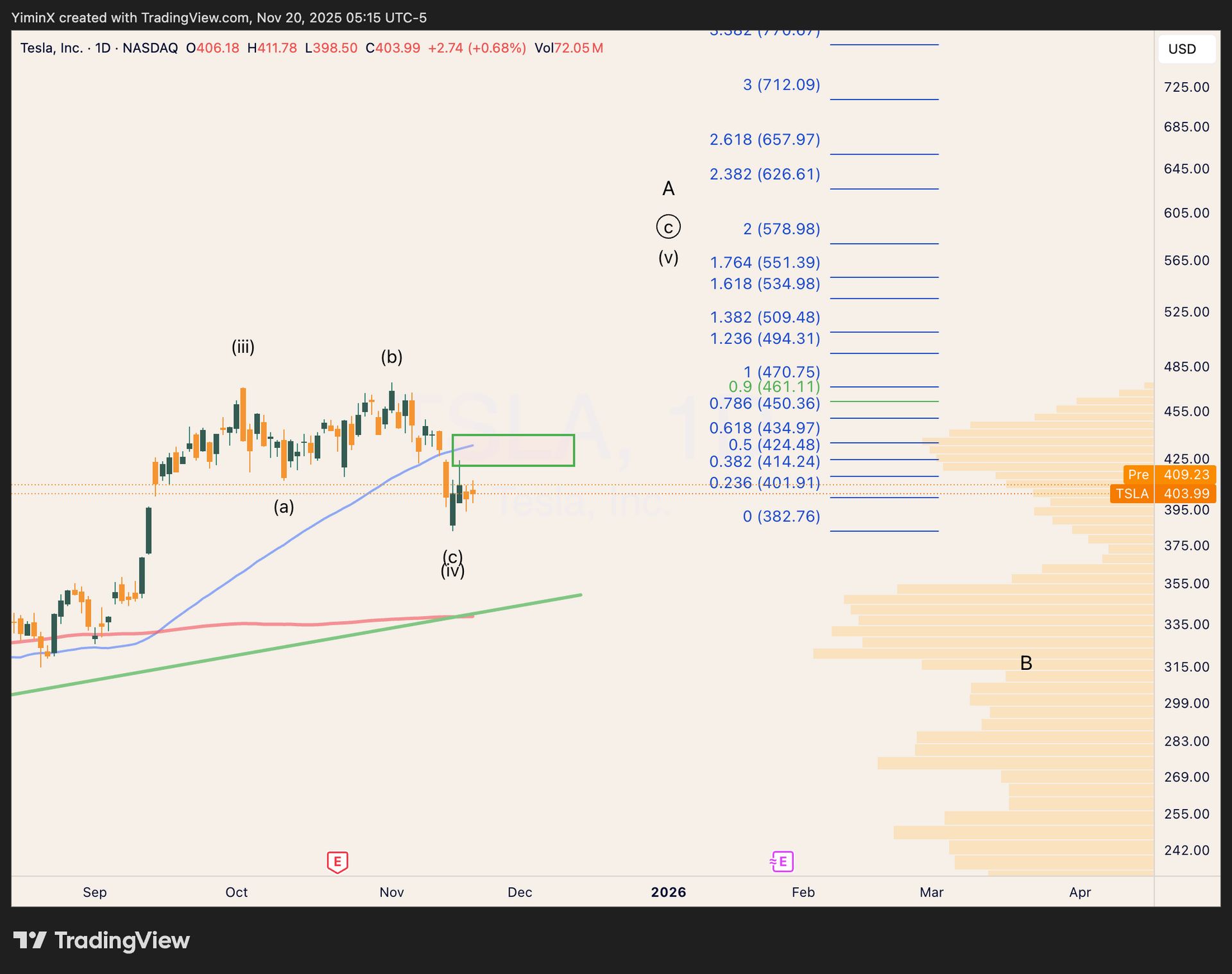 While I remain bullish on TSLA, it does have a clear hurdle to overcome next. Namely, it needs to get past the heavy volume profile around the 50-day MA ($420-440), which now acts as the immediate resistance.