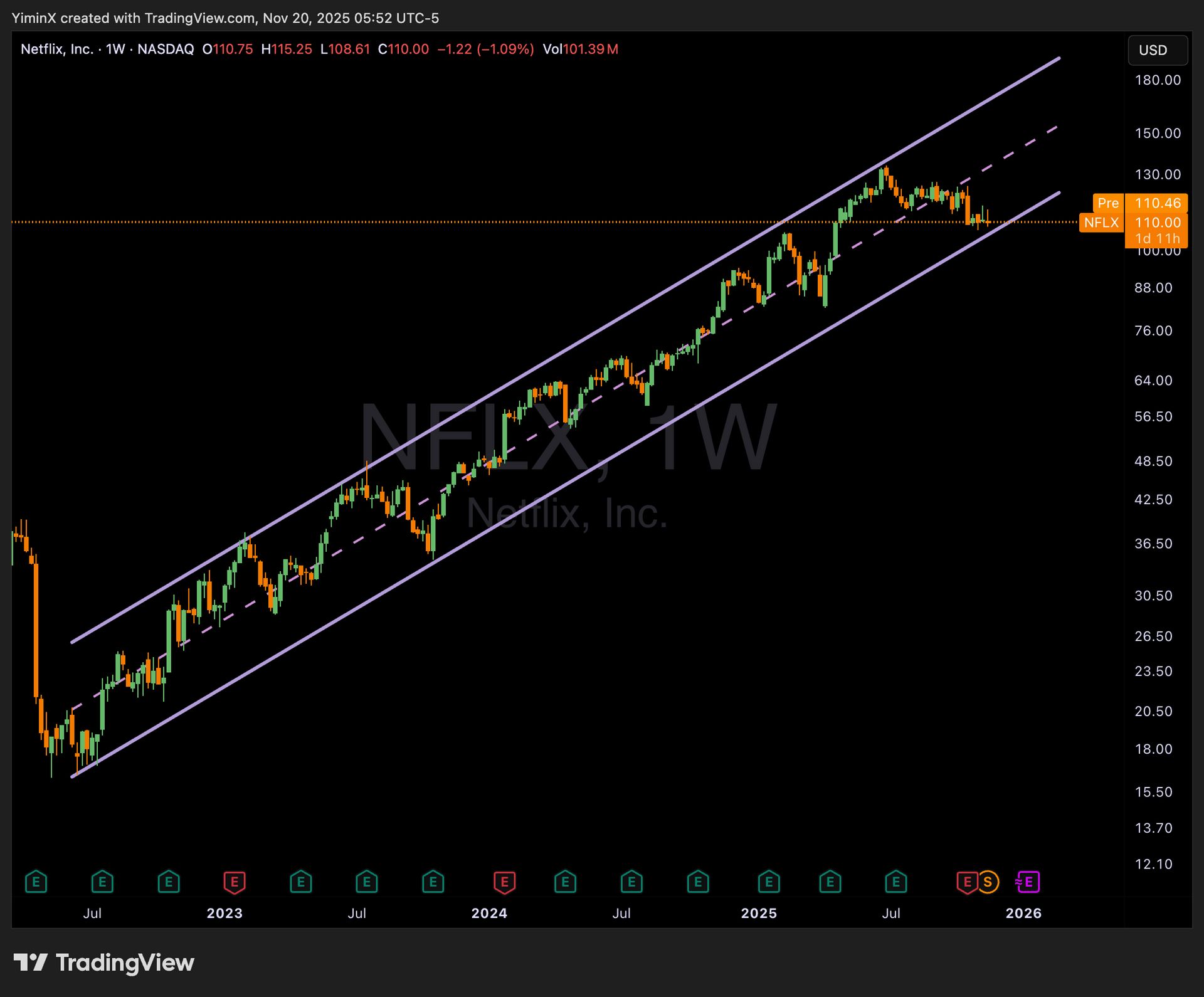 NFLX has been in a well-defined long-term uptrend since the 2022 low. As it closes in on the bottom trendline of the channel, the price appears in an attractive region for the long-term dip-buyers.
