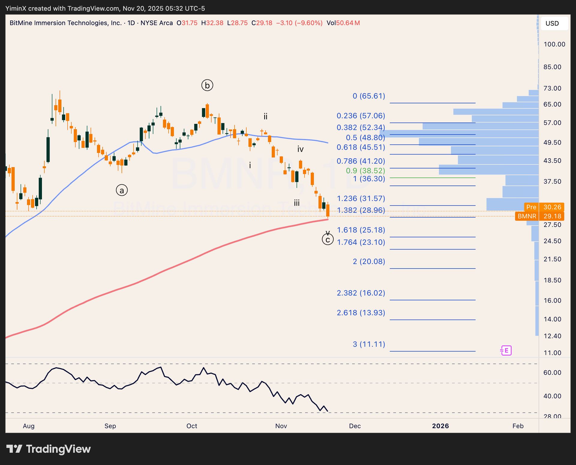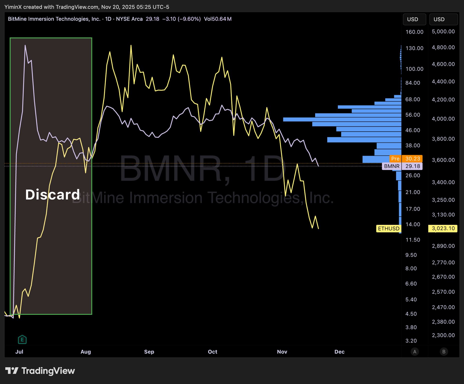In order to analyse BMNR using technical analysis, I would argue we do need to align the price action with ETH. This means discarding the July spike, when it was just announced that Tom Lee would join BMNR and turn it into an ETH Treasury. The wild price action of BMNR around that time is not meaningful for analysing crowd psychology.