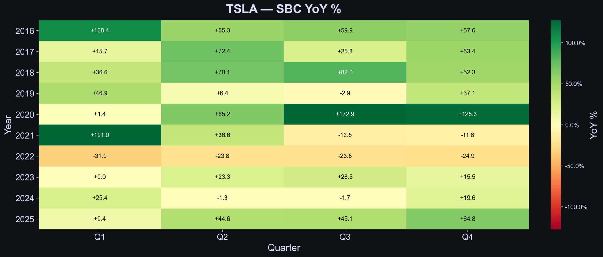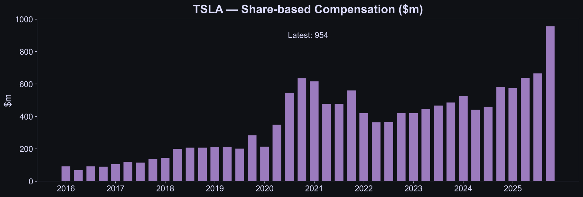 Tesla’s stock-based compensation increased in the latest quarter. There was a rise in SBC for engineering and AI roles, but Tesla also began recognising expenses related to its 2025 CEO Performance Award.