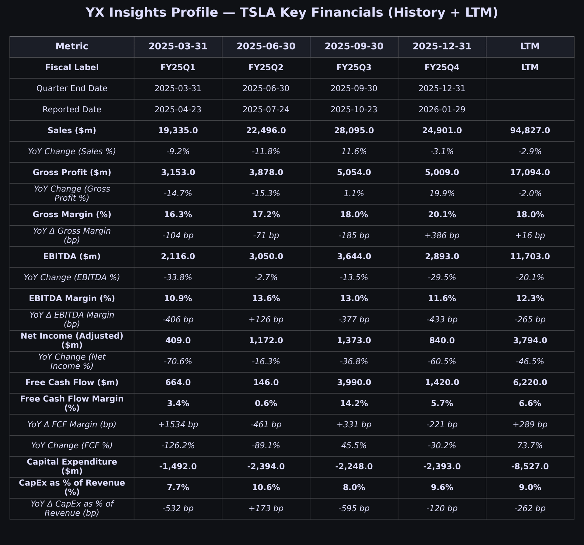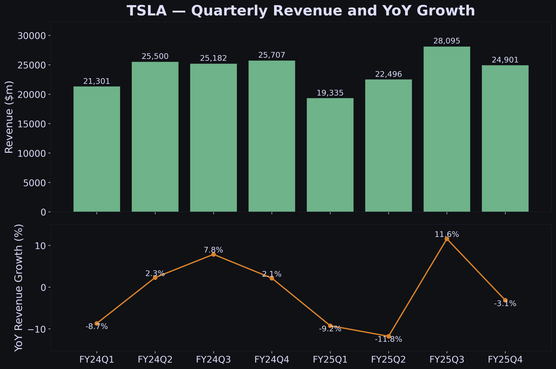 TSLA’s Q4 revenue saw a 3.1% YoY decline to $24.9 billion, on the back of both lower deliveries and regulatory credits. There was a demand pull from Q4 into Q3 due to the IRS credit cliff, which affected Q4. Tariffs negatively impacted the energy segment (Tesla's Shanghai Gigafactory produces the Megapack).