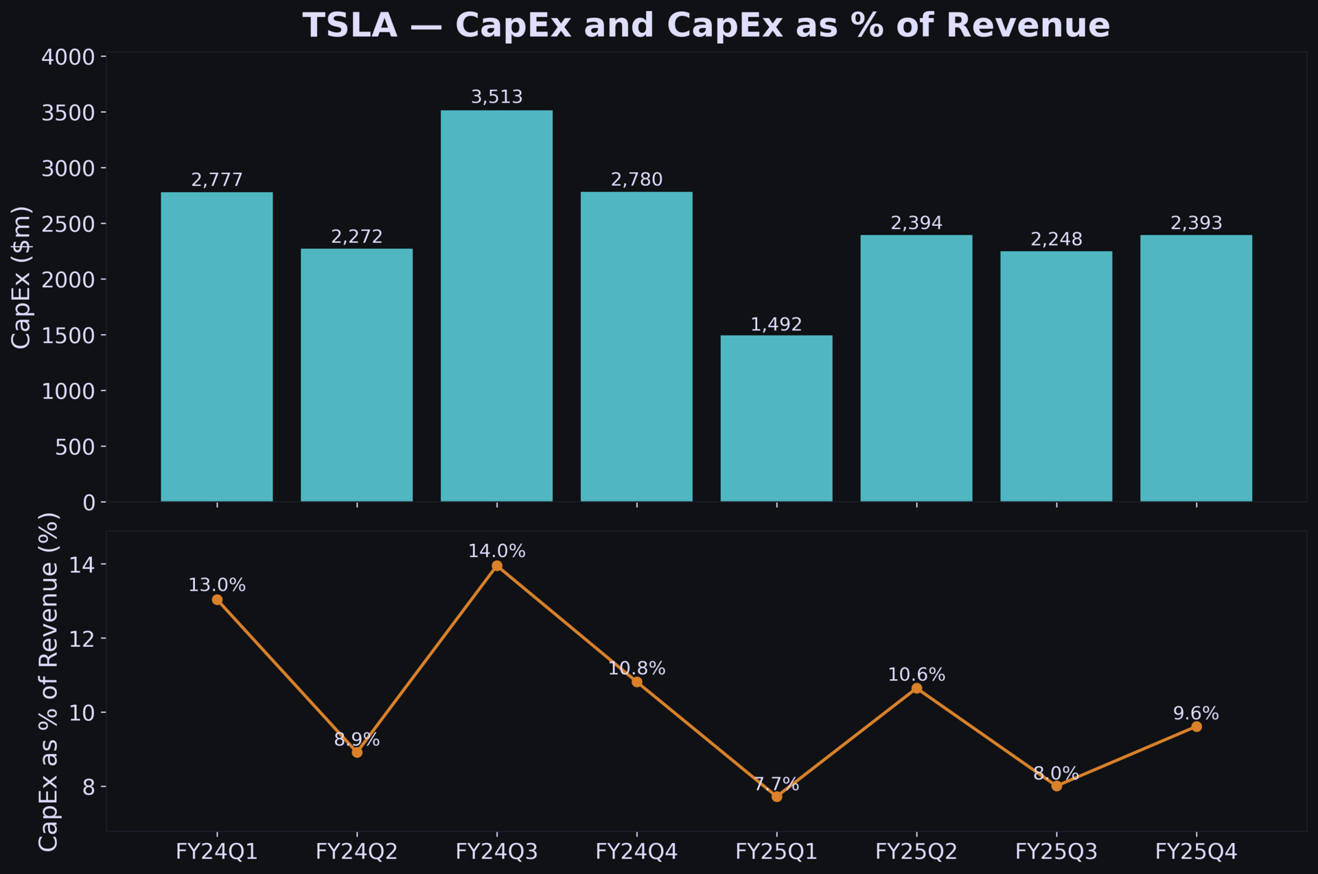 Tesla guided to CapEx of $20+ billion in 2026, tied to six factories/lines (refinery, LFP factories, Cybercab, Semi, a new Megafactory, and an Optimus factory), plus AI compute infrastructure and expansions to existing factories. This is more than twice the 2025 level.