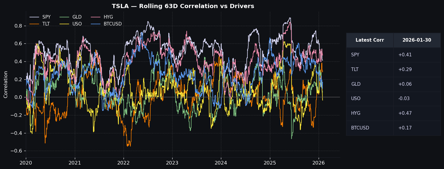 Tesla shows the greatest correlations to SPY and HYG (high-yield credit). Recently, it has traded in a positive correlation with TLT (long-end bonds).