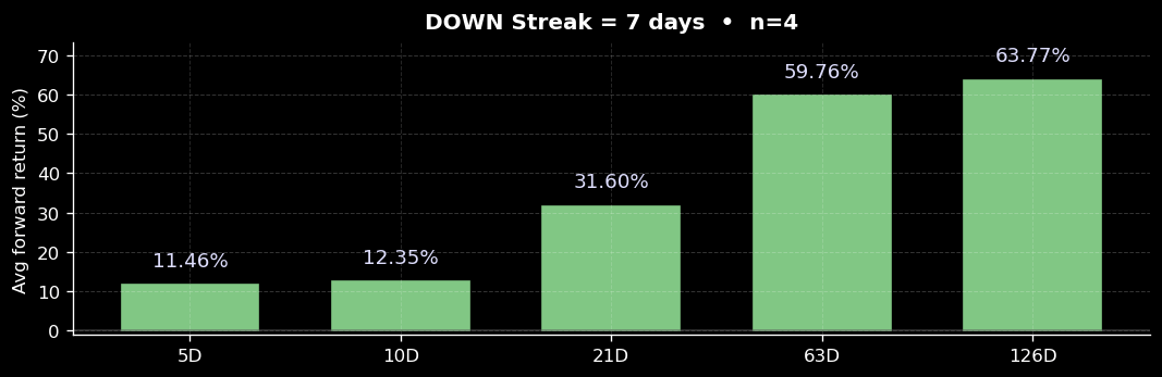 Separately, Tesla tends to perform well after 7 consecutive down days, i.e., after falling 7 days in a row.