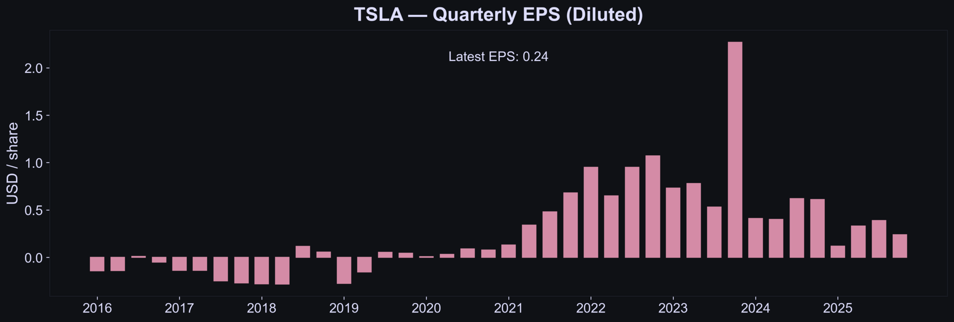 TSLA’s earnings per share have declined for straight quarters on a year-over-year basis.