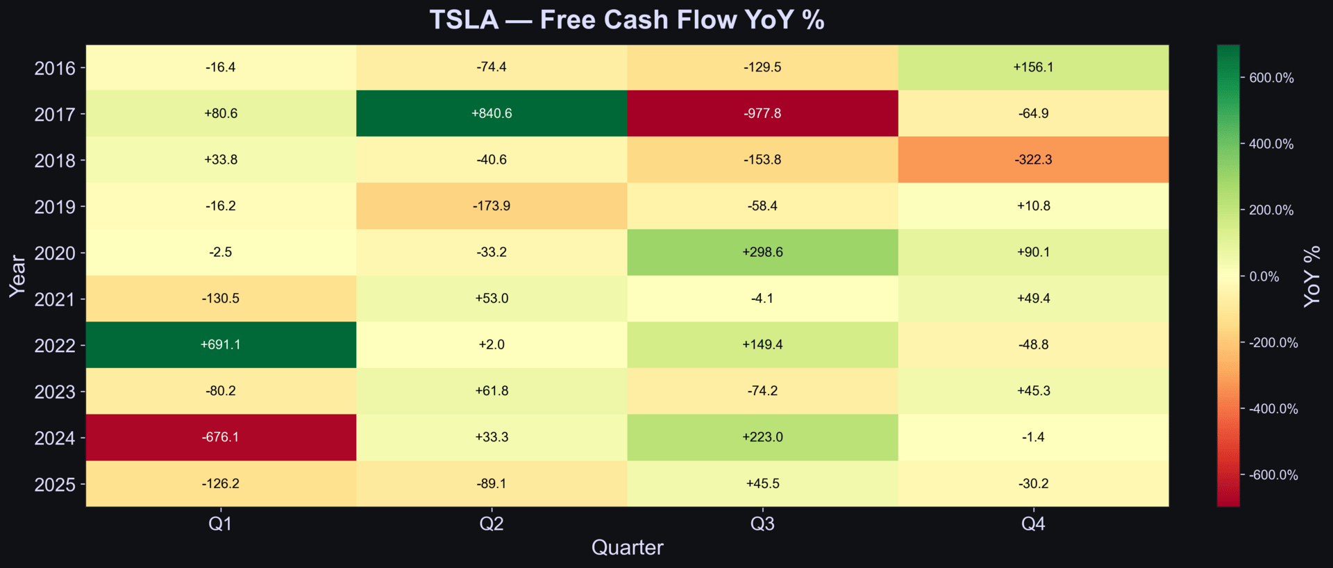 Tesla’s free cash flow declined from Q3 (which was the highest quarter ever). I’m not surprised by this, given the quarter's revenue decline, higher operating expenses, and higher CapEx.