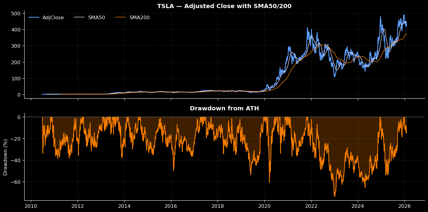 Tesla is no stranger to regular drawdowns. As recently as 2022-23, it fell 74% at one point.