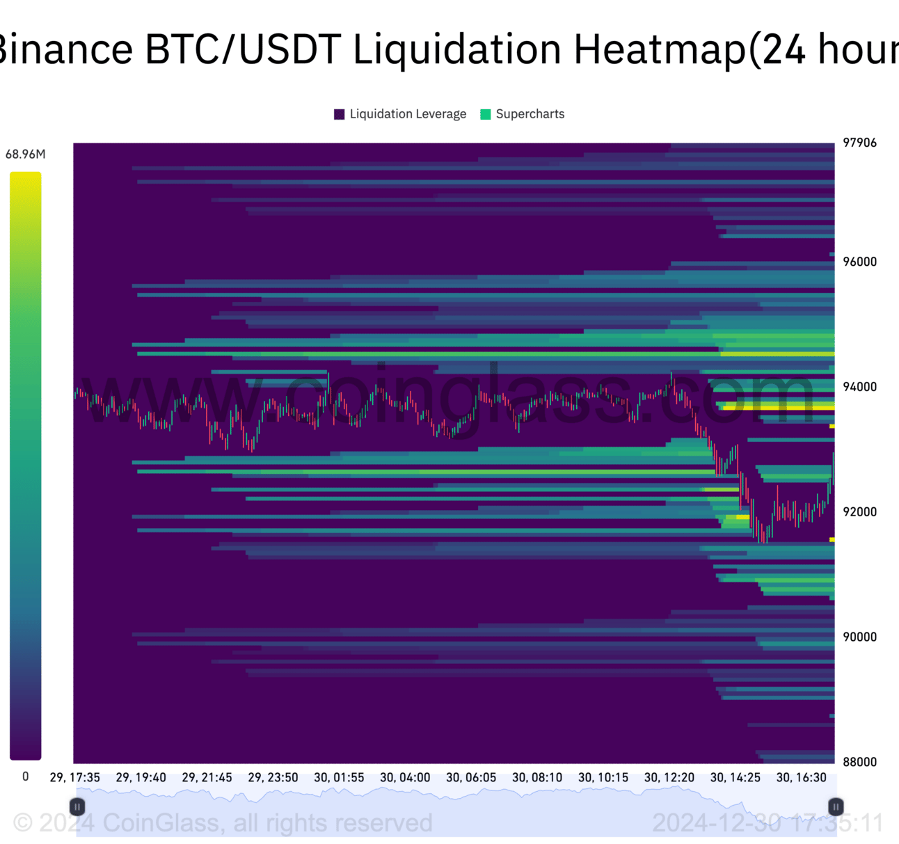 The Heatmap above suggests that a lot more leveraged short will get liquidated at $93.5-$95k than the leveraged longs below $91k.