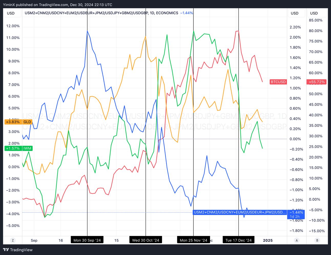 On this messy chart above, we have the Global Liquidity (Blue), GLD (Yellow), IWM (Green), and BTCUSD (Red). We can see that Global Liquidity peaked on September 30th. Exactly a month later on October 30th, GLD peaked. IWM subsequently peaked on November 25th. Finally, BTCUSD’s latest all time high was seen on December 17th.