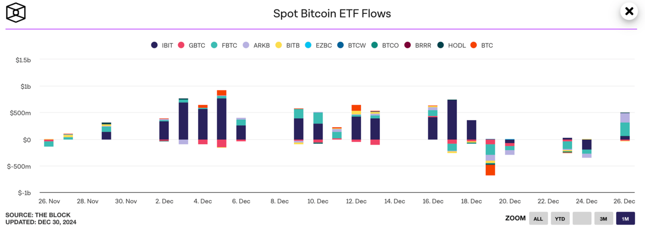 However, we did see a $500 million rebound in ETF flows on Boxing Day, suggesting institutional investors could be back to buying the dip.